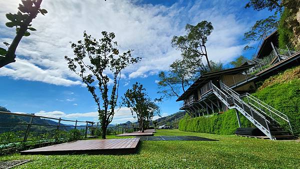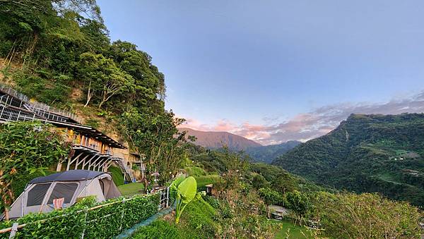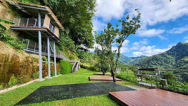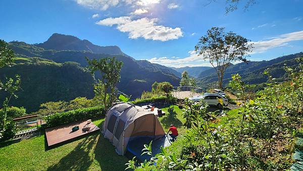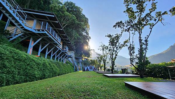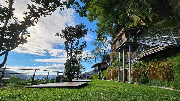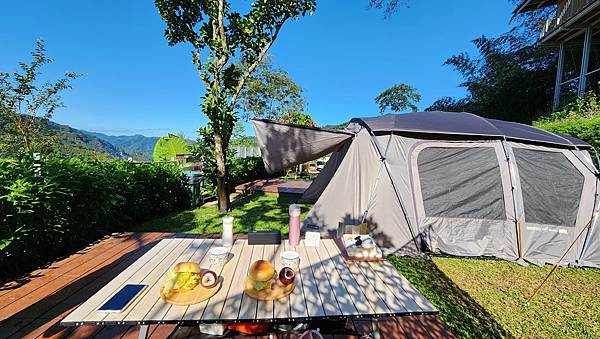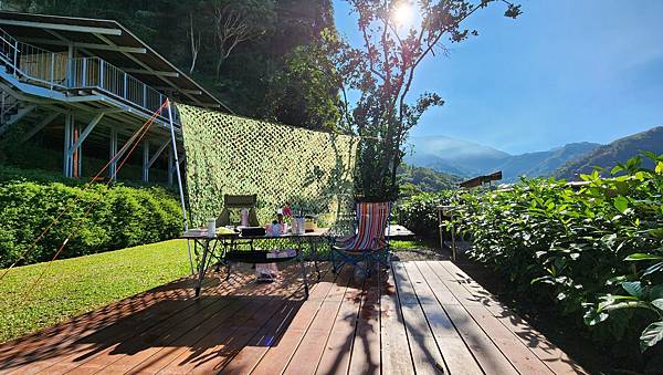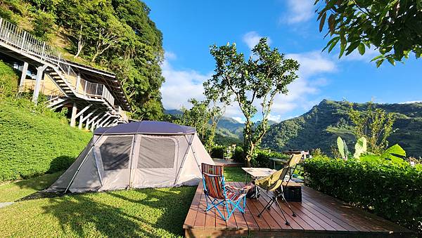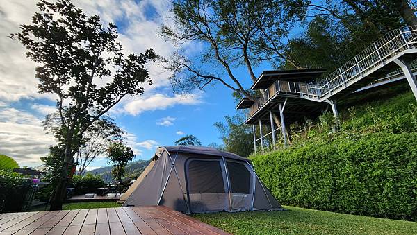 從A區旁的樹屋與平台的設置可以看出營主的用心,乾淨整齊的營區搭配秀麗的山景,天氣也冷熱適中,心情瞬間輕鬆愉悅起來。