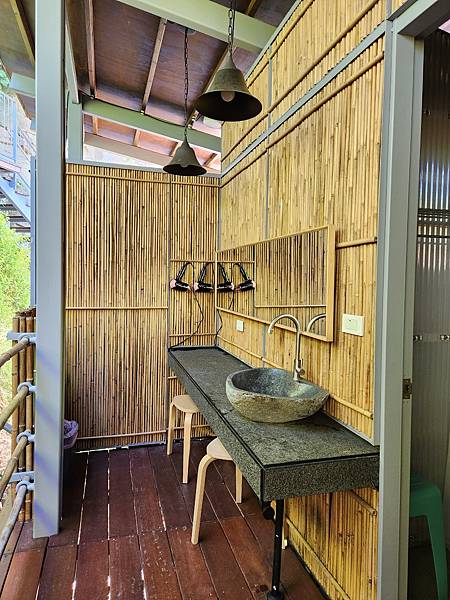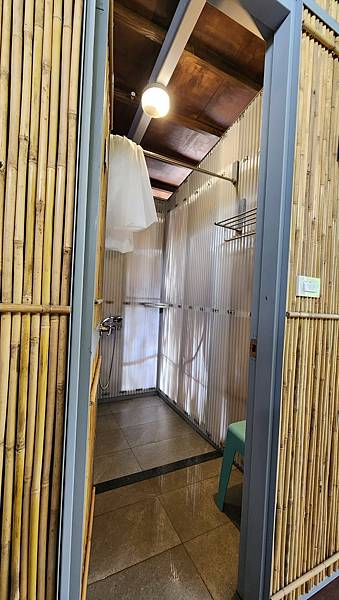 浴室乾濕分離,外側地面稍高,有鐵架和椅子可置物;內側較低、方便排水,分界處有黑色標線提醒露客,也有浴簾防濺水。