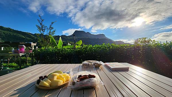 被修剪過的柚子樹蔭不夠大,不過秋陽沒那麼炙熱,加上微風徐徐,簡單用迷彩網擋一下,棧板區便是一個舒適悠閒的景觀早餐吧了!
