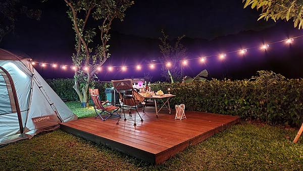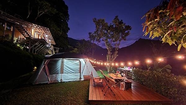 每一個營位的木棧板都是3x3公尺,我們的別墅帳只好搭在草地上,不過棧板倒是極佳的賞景休憩區。