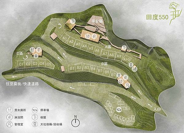 田度550的海拔正好是550公尺,取名『田度』乃『甜度』的諧音,希望露客可以在這裡留下幸福甜蜜的回憶。