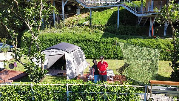 從A1旁的觀景平台縱覽營區,每個棧板旁都有一棵30年的柚子樹,樹上還掛著黃澄澄的柚子呢!