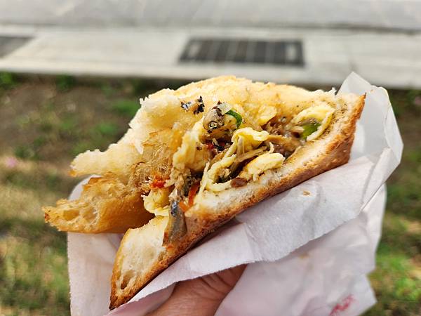 燒餅不是我們熟悉的、一層層薄薄的酥皮組合而成,而是一整片香酥軟的厚麵皮,油條是心心念念記憶中剛出爐的酥脆口感,加了干貝醬的蔥蛋讓整套燒餅相當juicy,沒有枉費我們一大早從台灣本島空著肚子飛到澎湖才吃早餐的辛勞。