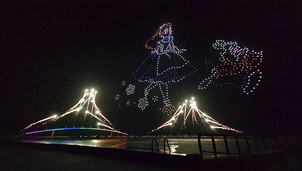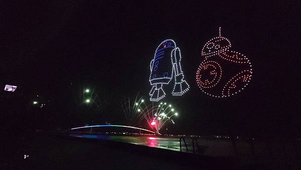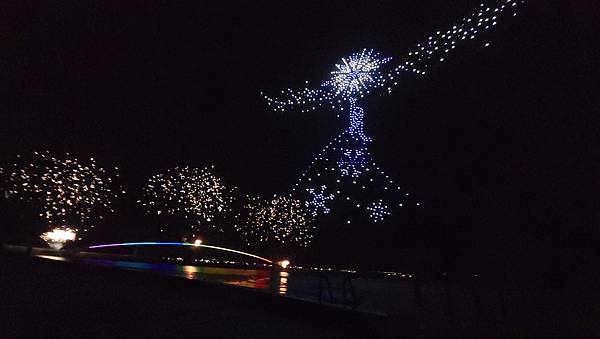 九點鐘一到,700台無人機準時在我們的前方不遠處出現,這時才發現我們誤打誤撞(應該是判斷正確),正好站在花火節的最佳拍照熱點,真是太幸運了!